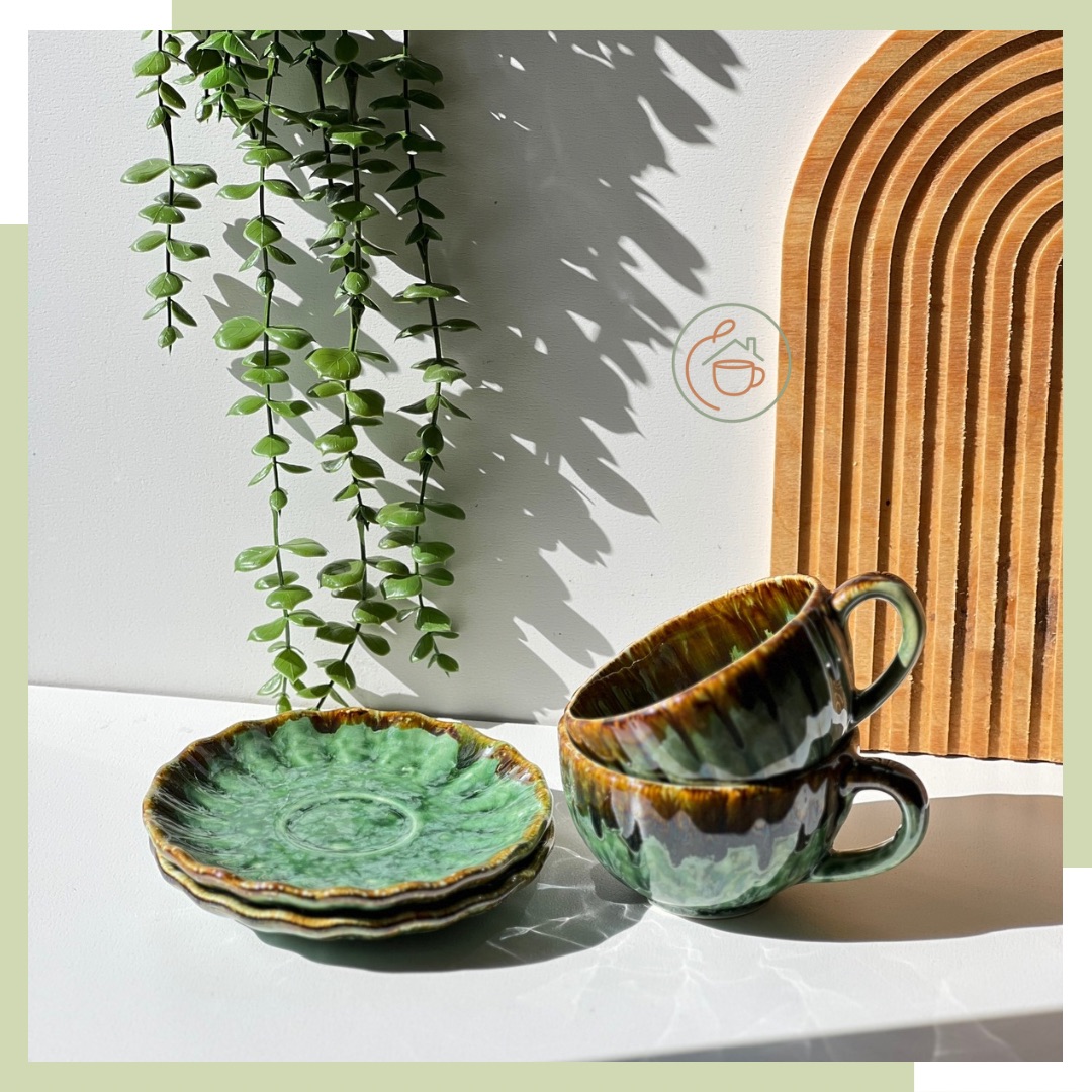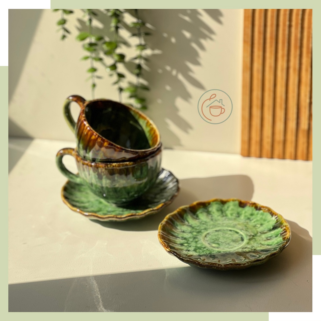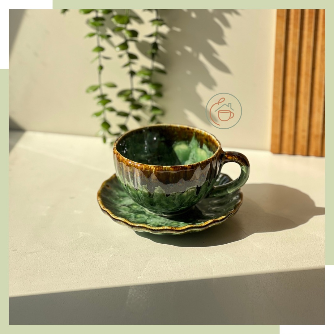 فنحان و نعلبکی سرامیکی سبز شره ای