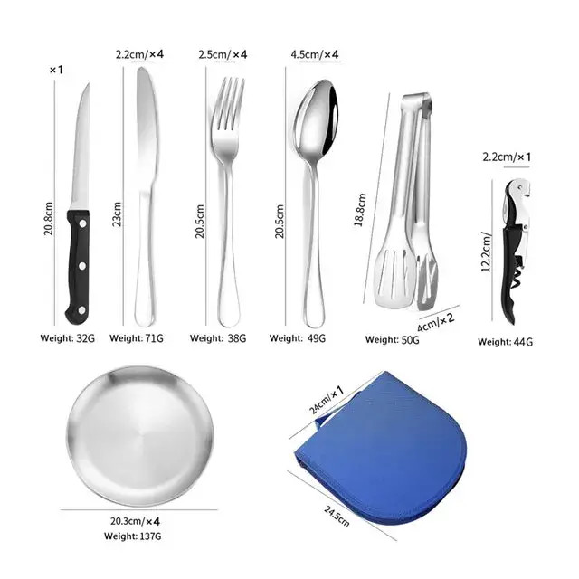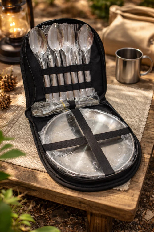 اقلام همراه: ,۴ عدد چنگال استیل ضد زنگ,۴ عدد قاشق استیل ضد زنگ,۴ عدد قاشق چایخوری کوچک,۴ عدد بشقاب استیل گرد,۲ عدد انبر استیل مخصوص سرو غذا,یک کیف حمل زیپدار مقاوم و کاربردی