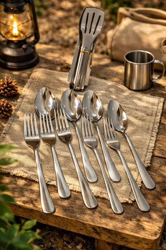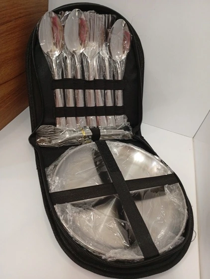 اقلام همراه: ,۴ عدد چنگال استیل ضد زنگ,۴ عدد قاشق استیل ضد زنگ,۴ عدد قاشق چایخوری کوچک,۴ عدد بشقاب استیل گرد,۲ عدد انبر استیل مخصوص سرو غذا,یک کیف حمل زیپدار مقاوم و کاربردی