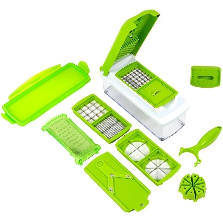همه ما حرکت سریع دستان سرآشپزهای حرفه ای را هنگام قطعهقطعه کردن میوه و سبزیجات با چاقوهای بسیار تیز دیدهایم. تقریبا همهی ما برای یک بار هم که شده، تلاش کردهایم تا این کار مهیج را امتحان کنیم و البته شاهد نتایج دلخراشی بودهایم. مسلما آشپزهای حرفهای، برای انجام این کار، سالهای زیادی تمرین کردهاند تا یاد گرفته اند چگونه بدون صدمه زدن به دستانشان با سرعت خیلی زیاد، میوه و سبزیجات را به قطعات کاملاً هماندازه، گاهی خیلی ریز و نازک و گاهی درشت تقسیم کنند. خردکن نایسر دایسر پلاس Nicer Dicer Plus وسیلهای چندکاره است. این وسیله این امکان را فراهم میکند تا شما بتوانید پیاز، گوجهفرنگی، خیار و سایر موادغذایی را در زمانی کوتاه و بهراحتی، در اندازههای دلخواهتان خرد کنید. همچنین با استفاده از تیغههای تیز این غذاساز میتوانید در هر ثانیه، چندین برش با شکلهای متفاوت انجام دهید. این غذاساز دارای یک رندهی تیز دارای روکش و یک پوستکن با دستهی ارگونومیک است که شرایط پوست کندن را آسانتر میکند. به محتویات این غذاساز میتوان ظرف دردار آن را اضافه کرد که از جنس پلی کربنیک است. این ظرف ضد خش، لکه و ضربه بوده و برای ذخیره کردن مواد غذایی خردشده در یخچال و فریزر مناسب است. امکان شستوشوی این ظرف با ماشین ظرفشویی وجود دارد. این خردکن دستی نایسر دایسر یک بستهی کامل شامل خردکن، لهکن، پوستکن و رنده به همراه یک ظرف دردار ذخیرهسازی است که تمام کارهای یک سرآشپز را برای آمادهسازی موادغذایی قبل از طبخ غذا، در کمترین زمان ممکن و امنترین روش انجام میدهد.